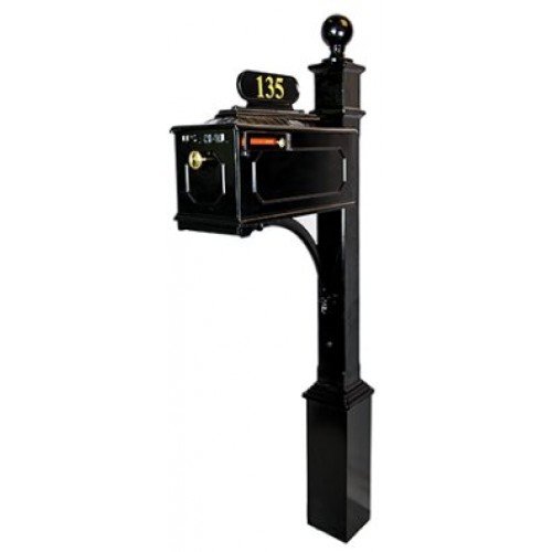 All aluminum components. Post is constructed of heavy duty extruded aluminum measuring 6" x 6" at base, tapering up to a 4" x 4" square cast post. Mailbox is cast aluminum and bolted to the post from the back of the mailbox creating one of the most solid and firm construction feels in the mailbox industry.