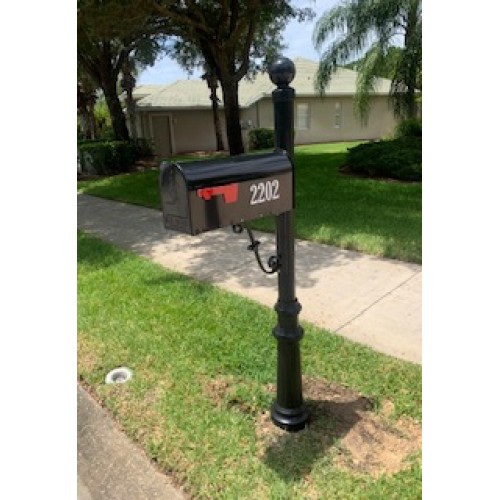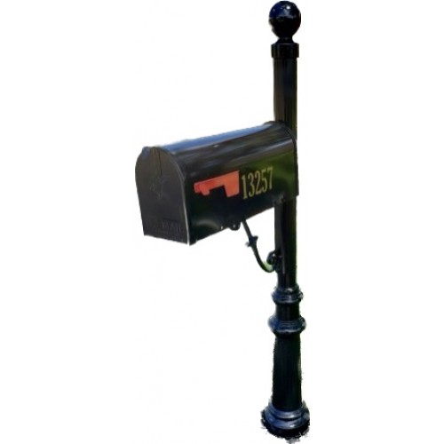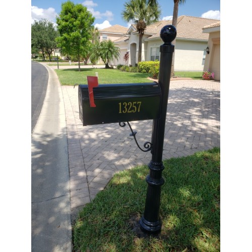 All aluminum components with a baked on powder coated finish. Components consist of 3" round fluted post, Naples style base, single collar style bracket, Gibraltar brand mailbox and choice of finial on top of post.