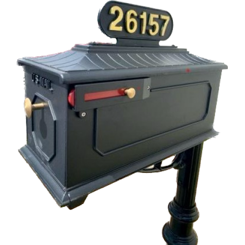 All cast aluminum with baked on powder coated finish. Top mount address plaque included. Brass door knob, modern flag system and heady duty hinge along bottom of door.